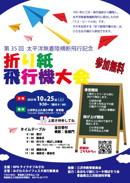 第35回太平洋無着陸横断飛行記念「折り紙飛行機大会」が開催されます。