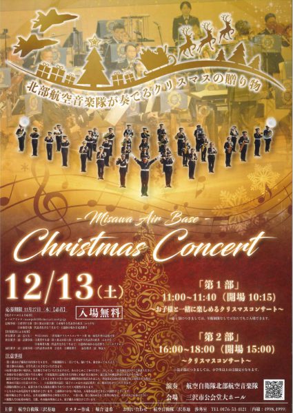 航空自衛隊三沢基地 主催による「航空自衛隊北部航空音楽隊」演奏の「三沢基地クリスマスコンサート」が開催されます。