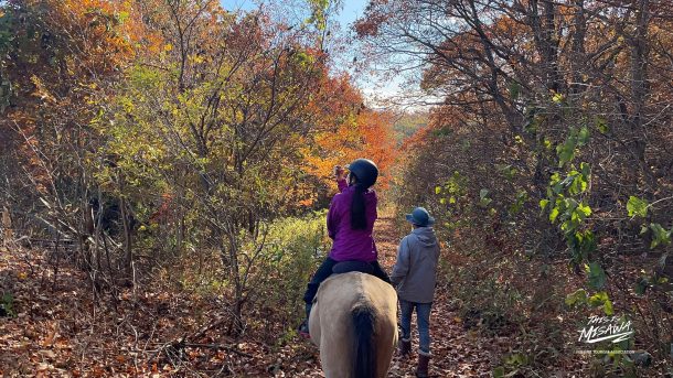 馬の背に揺られながらゆっくりと森へ入っていくと、コツコツと響く心地よい蹄の音がリズムのように耳に届き、自然とリラックスした気持ちに。